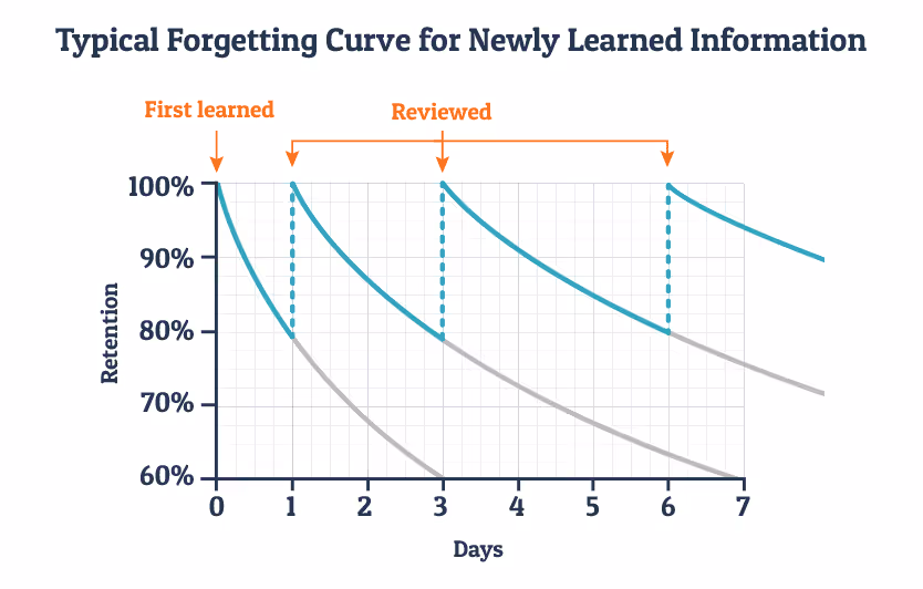 עקומת השיכחה הבסיסית מראה שאנחנו שוכחים עד 70% ממה ששמענו או ראינו תוך זמן קצר. אם אנחנו רוצים לשמור דברים בזיכרון לטווח ארוך, אנחנו צריכים לקשור את קצה החוט - להיזכר.